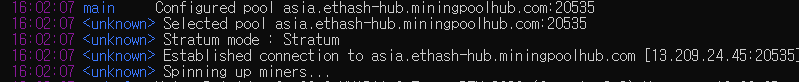 ethminer -U -P stratum+tcp://아이디.사용자번호:x@asia.ethash-hub.miningpoolhub.com:20535